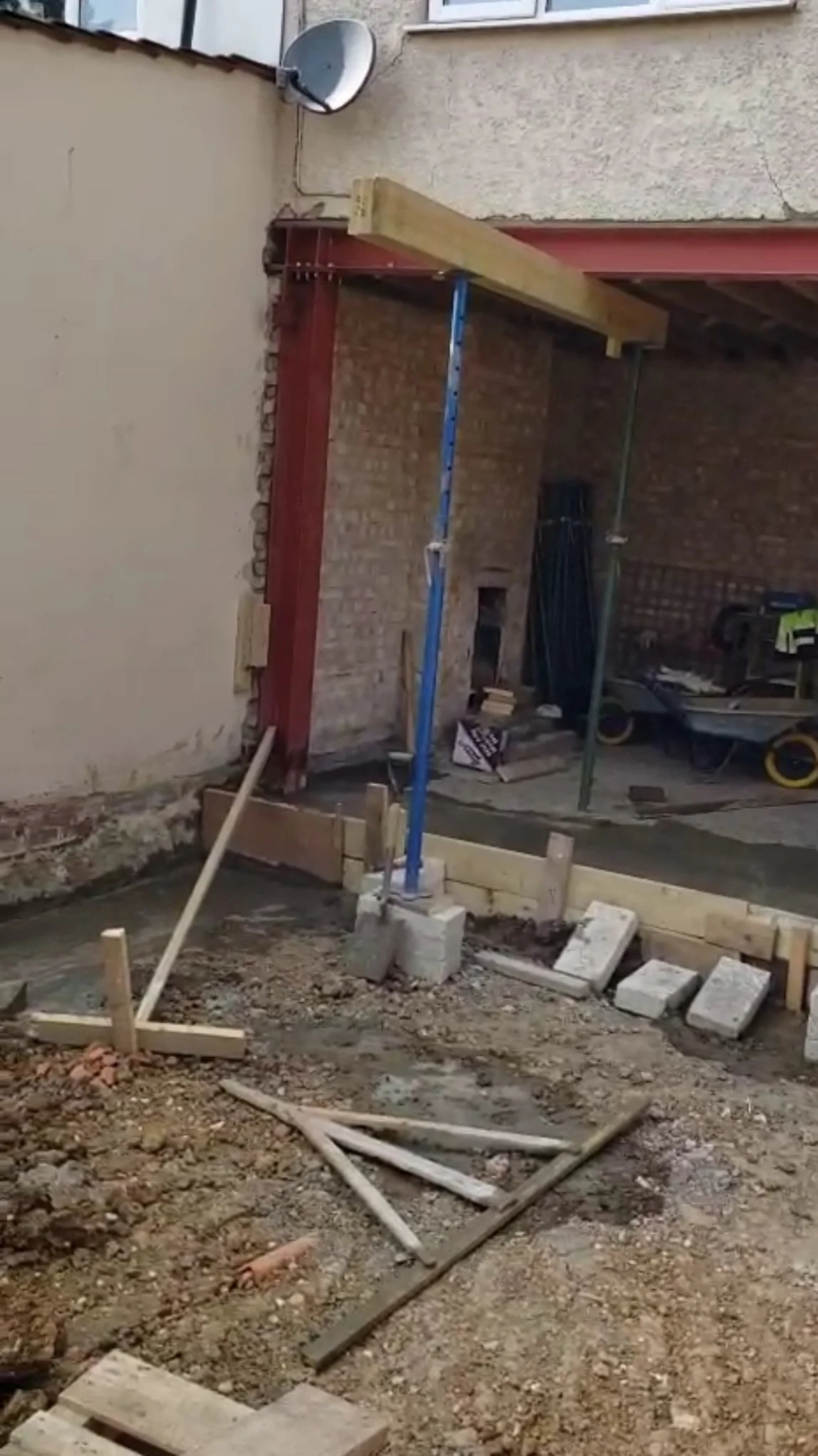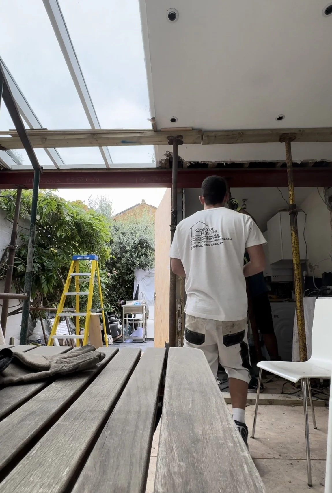 Wall removal, steel beam installation, and space reconfiguration.